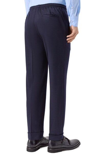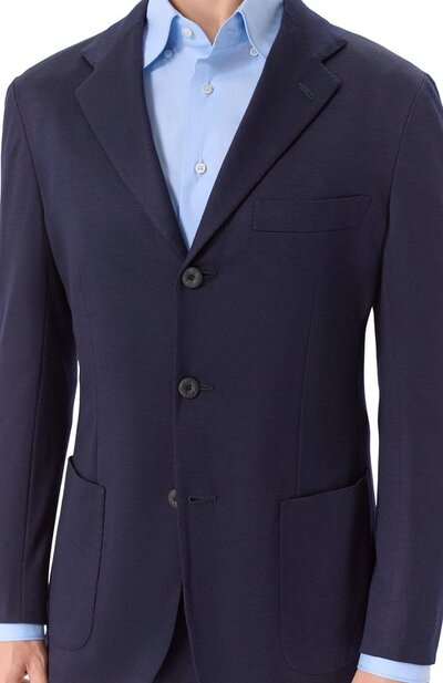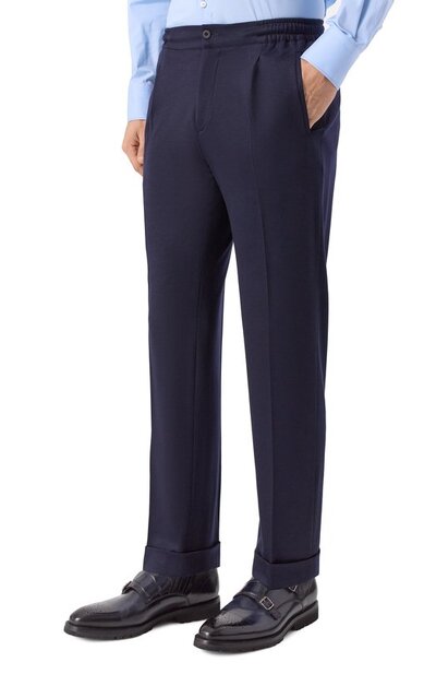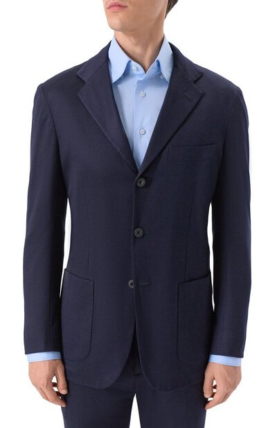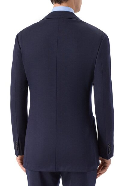 Костюм выполнили из чистой шерсти. Брюки с эластичной вставкой на поясе и отворотами дополнили четырьмя карманами, а у пиджака с парой шлиц сзади предусмотрели нагрудный и два боковых кармана.