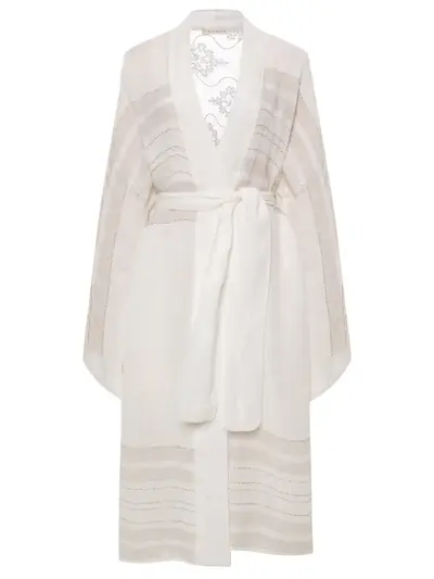 -Туника из смесового льна от MAURIZIO. -Модель свободного силуэта со спущенной линией плеча, длинными широкими рукавами, декором шитьем и кружевом, акцентным поясом, который подчеркивает талию и структурирует силуэт.