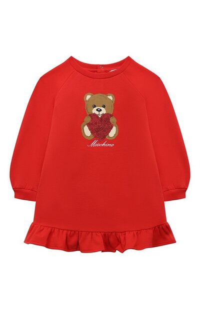 Для пошива красного платья с кнопками сзади использовали мягкий хлопковый футер с фактурной изнанкой. Материал из ультрадлинных пористых волокон хорошо пропускает воздух и при этом удерживает тепло. Модель украсили спереди ярким мотивом в виде узнаваемого игрушечного медведя, а подол подчеркнули оборкой.