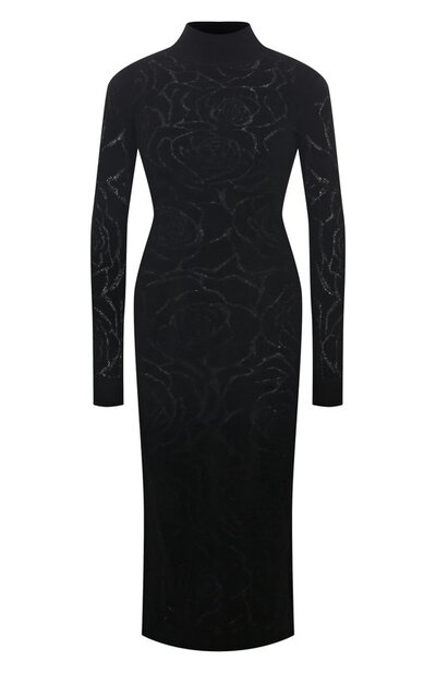 Черное платье идеально облегает фигуру: для его пошив Альберта Ферретти выбрала эластичный трикотаж на базе нежной вискозы. Переплетение нитей сформировало на текстиле крупный мотив в виде распустившихся бутонов роз. Модель с высоким воротом, как у водолазки, не нуждается в застежках.