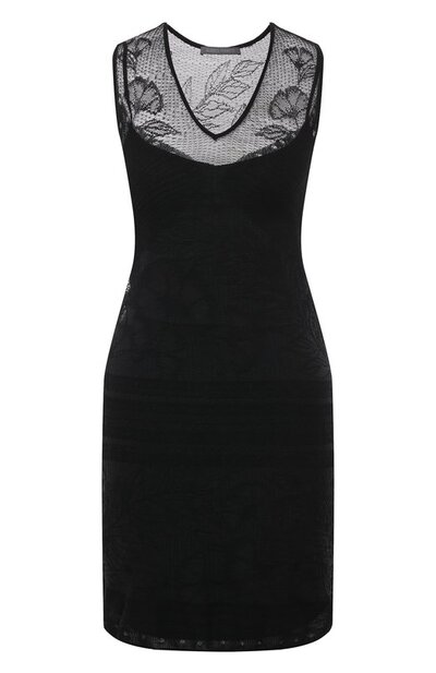 Альберта Ферретти сделала трикотажное мини-платье похожим на наряды из кружева. Тончайшая вискозная сетка с деликатным блеском дополнена крупным цветочным узором их более плотных нитей. Платье дополнено нижней комбинацией из эластичного атласа в тон, которая оставляет открытыми плечи и верх спины, делая цветочный рисунок в этих местах более заметным.
