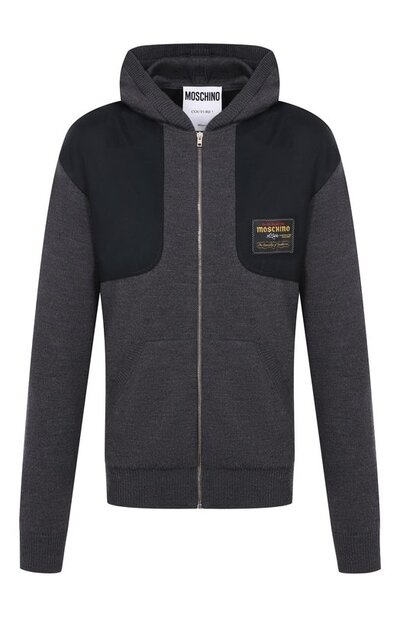 Кардиган с капюшоном и двумя накладными карманами выполнен из шерстяного трикотажа. Одна из двух саржевых вставок украшена брендированным патчем. Модель застегивается молнией.