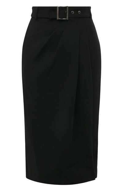 Альберта Ферретти поэкспериментировала с кроем лаконичной прямой юбки длиной до колен. Спереди дизайнер заложила объемные асимметричные складки, в которые безупречно ложится прочная костюмная ткань черного цвета. Широкий пояс с прямоугольной пряжкой позволяет поставить деликатный акцент на талии.