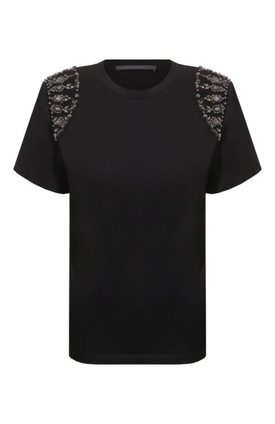 Альберта Ферретти нашла способ сделать черную базовую футболку более нарядной, декорировав плечи сетчатыми аппликациями с объемным узором, выложенными крупными кристаллами. Модель изготовили из мягкого хлопкового джерси, поддерживающего оптимальный микроклимат.