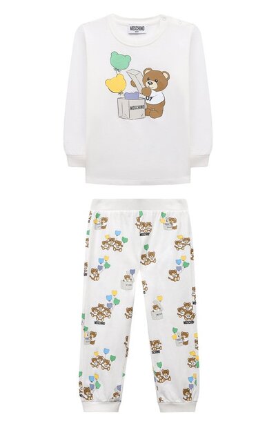 Для пошива белого комплекта использовали мягкий хлопковый трикотаж, который не раздражает кожу, хорошо пропускает воздух и быстро отводит влагу. Свитшот декорировали спереди крупным принтом в виде узнаваемого персонажа Teddy Bear. Ему вторит разноцветный паттерн на джоггерах с широким эластичным поясом.