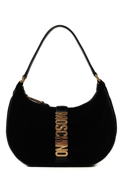 Небольшую сумку Moschino Belts с длинной ручкой сшили из мягкой тонкой замши с бархатистой фактурой. Черный цвет материала стал идеальным фоном для позолоченной накладки в виде логотипа марки, закрепленной на вертикальном ремешке из матовой кожи спереди. В аксессуар, застегивающийся на молнию, поместятся кошелек, смартфон, очки.