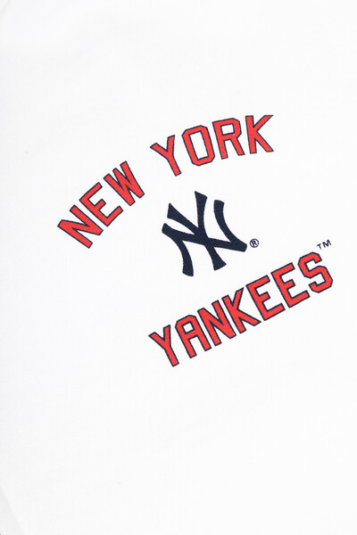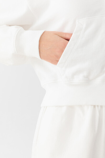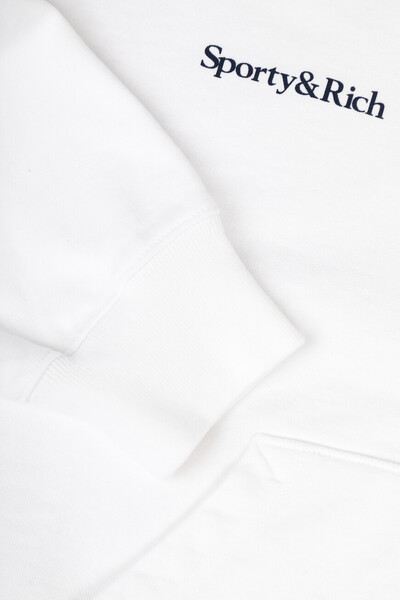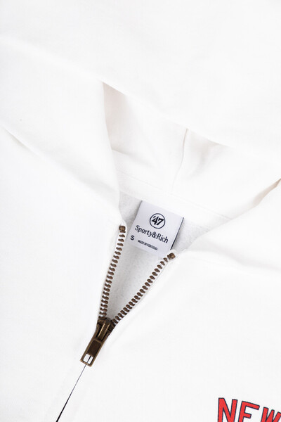 Укороченная белая толстовка Sporty&Rich. Модель Homerun, сшитая из хлопкового джерси, оснащена глубоким капюшоном и надписями на лицевой стороне: слева лаконичный логотип Sporty&Rich, справа – культовая надпись New York Yankees, создающая спортивно-гламурный контраст. Толстовка застёгивается на молнию и сочетается с шортами на резинке из той же коллекции Дома.