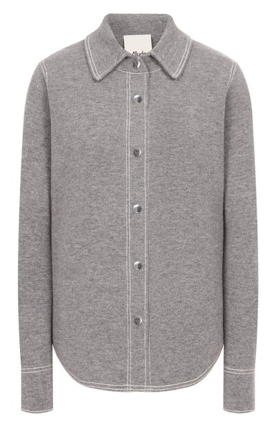 Для создания рубашки с фигурным низом и прямоугольными манжетами использовали трикотаж из микса шерсти и кашемира. Модель, прошитая контрастной нитью, застегивается кнопками.