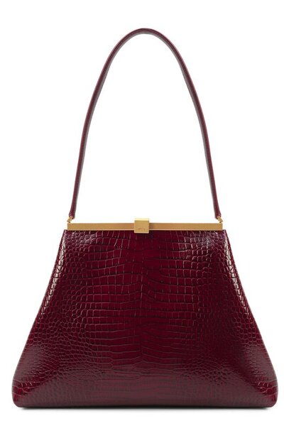 Сумку Puffy Jeanne с брендированным рамочным замком изготовили из глянцевой коровьей кожи с тиснением под крокодила. Трапециевидный аксессуар с ручкой средней длины дополнили плоским внутренним карманом.