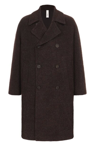 Для пошива двубортного пальто Tricase использовали фактурный трикотаж из хлопка, полиэстера, акрила и шерсти. Модель со спущенной линией плеч дополнили двумя втачными карманами по бокам.