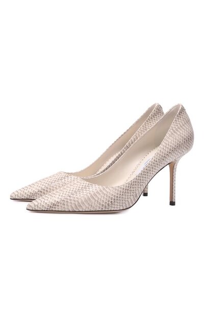 Туфли Love с зауженным мысом выполнили из кожи с принтом под змею, таким же материалом обтянули высокий каблук. Задник пары с брендированной стелькой украсили фирменной монограммой JC.