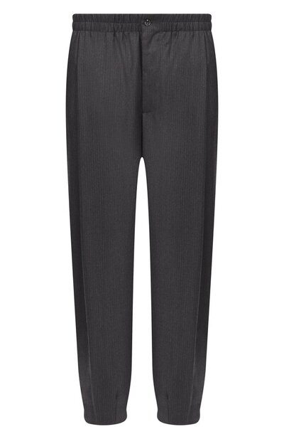 Брюки выполнили из шерсти с едва заметным полосатым узором. Модель с эластичным поясом и защипами спереди дополнили двумя карманами по бокам и еще парой сзади, застегивающихся пуговицами.