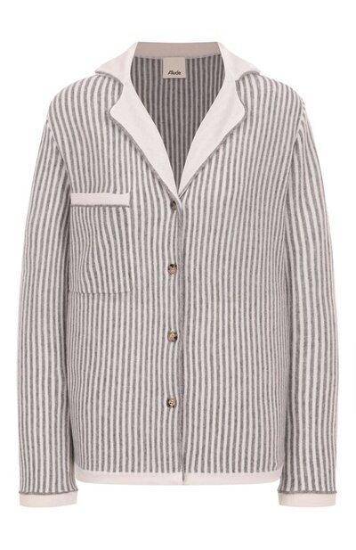 Полосатую рубашку на роговых пуговицах выполнили из шерсти с добавлением кашемира. Английский воротник, кант на нагрудном кармане и кайму на манжетах и низе модели сделали однотонными.