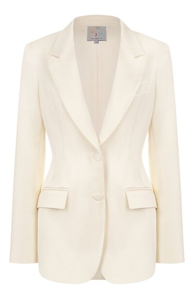 Жакет с подкладом из шелка стрейч выполнили из полиэстера с добавлением спандекса. Модель со шлицей сзади, нагрудным и парой боковых карманов дополнили обтяжными пуговицами в тон.