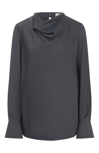 Топ прямого кроя сшили из атласного микса вискозы и шерсти. Модель с воротником-хомутом и расклешенными манжетами застегивается двумя обтяжными пуговицами сзади.
