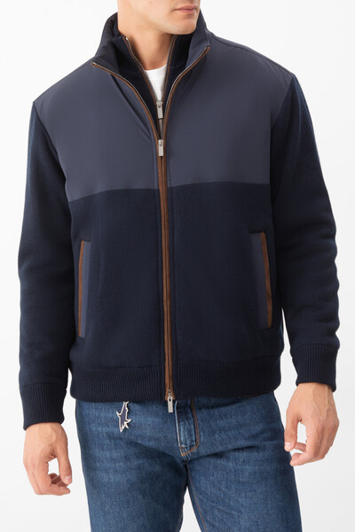 Кардиган Paul&Shark на встречной молнии с двумя пуллерами. Модель изготовлена из комбинации мягкого трикотажа на основе вирджинской шерсти, кашемира и вискозного волокна и прочного эластичного полиэфира - технологичной ткани Save The Sea на вставках. Отличительными деталями являются отделка из бархатистой замши по обе стороны планки застёжки и на боковых прорезных карманах, а также деталь в виде острого плавника акулы серебристого оттенка сзади на воротнике.
