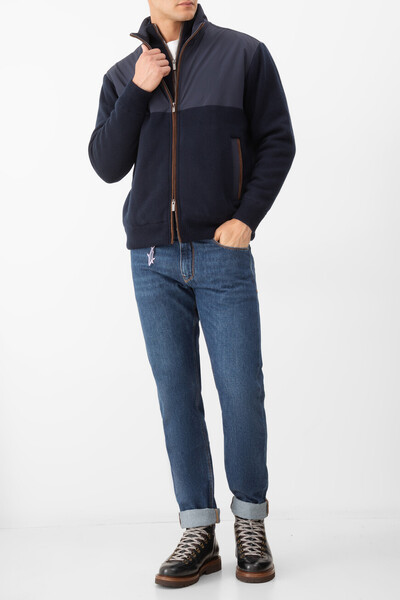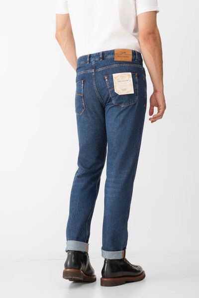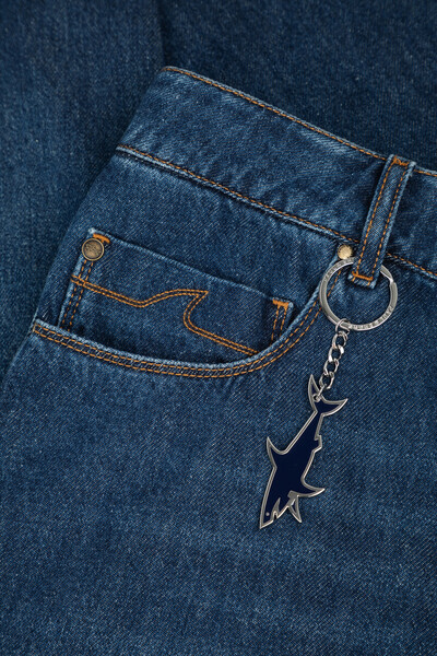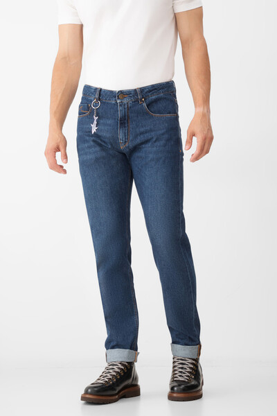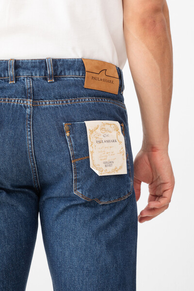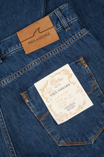Хлопковые джинсы Paul&Shark с оранжевой прострочкой на швах. Модель прямого силуэта сшита из мягкого денима с эффектом делаве и окрашена в синий оттенок. Отличительными деталями являются подвороты в нижней части и застёжка на потайную молнию, покрытую планкой, и брендированную металлическую пуговицу. Декором выступает прямоугольный замшевый патч со знаковой символикой - логотипом и изображением острого плавника акулы на плотном поясе сзади.
