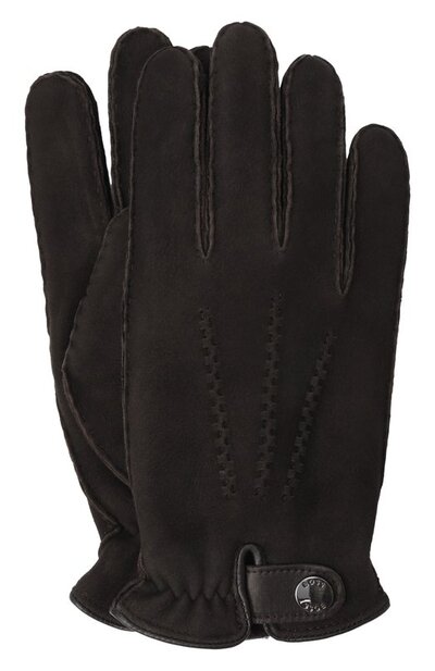 Перчатки со стичингом на тыльной стороне и рельефными швами выполнили из замши. Манжету с разрезом и вшитой резинкой дополнили кожаным ремешком с брендированной кнопкой.