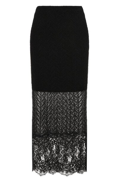 Юбку прямого кроя выполнили из ажурного трикотажа на основе мохера. Модель с высоким боковым разрезом и коротким шелковистым подкладом отделали фестончатым цветочным кружевом на низе.