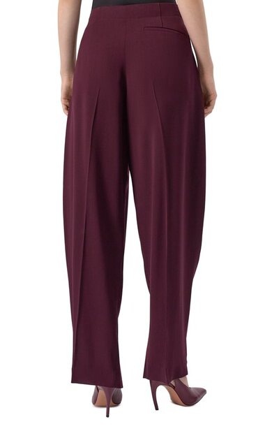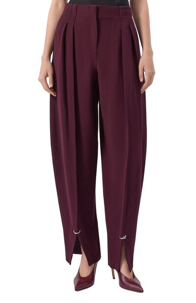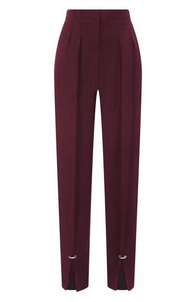 Брюки с цельнокроеным поясом и парными защипами спереди выполнили из вискозы с добавлением шерсти. Модель с двумя карманами по бокам, листочкой сзади и проглаженными стрелками дополнили короткими разрезами, украшенными кольцами-пирсингом снизу.