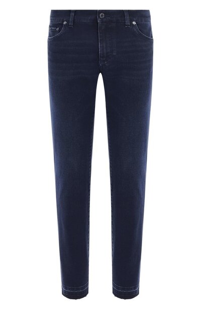 Джинсы изготовили из эластичного хлопкового денима с декоративными потертостями. Модель с необработанными краями брючин дополнена пятью карманами: задний украсили брендированной металлической пластиной, а монетный – узкой нашивкой с логотипом.