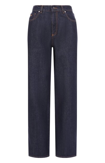 Джинсы с высокой посадкой украсили вышитыми литерами К на поясе и самом маленьком из пяти карманов. Для изготовления модели использовали жесткий хлопковый деним.