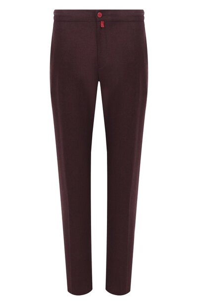 Брюки со стрелками и потайной кулиской на поясе дополнили четырьмя карманами. Модель из эластичной шерстяной фланели застегивается молнией и брендированной пуговицей в тон ярлыку фирменного алого оттенка спереди.