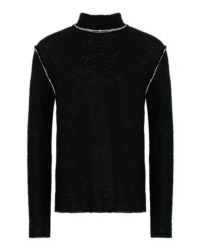 Этот джемпер — квинтэссенция утончённого стиля с неожиданными акцентами. Насыщенный чёрный цвет придаёт изделию шик и универсальность, прекрасно сочетающиеся с элегантными и повседневными образами. Материал отличается лёгкостью и воздушностью, создавая эффект объёма и текстуры. Он тщательно связан, обеспечивая комфорт и свободу движений. Свободный крой дарит изделию непринуждённость и удобство. Главный акцент — декоративные контрастные швы, которые подчёркивают линию плеч и воротник. Этот смелый дизайнерский ход добавляет изделию архитектурный интерес и современную эстетику. Воротник-стойка придаёт джемперу изысканную элегантность, ставя акцент на шее и создавая гармоничный силуэт. Отсутствие манжетов и эластичной обработки краёв добавляет лёгкости и непринуждённости. Такой джемпер станет выразительным элементом в гардеробе, сочетаясь как с классическими брюками, так и с более расслабленными джинсами, всегда подчёркивая индивидуальный стиль.