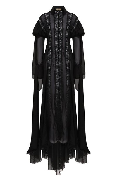 Длинное платье-рубашку на пуговицах в тон выполнили из шифона и фестончатого кружева. Спинку изделия дополнили шнуровкой, а рукава украсили съемными лентами.