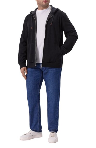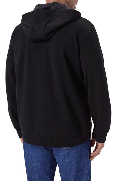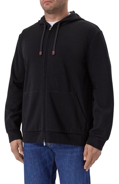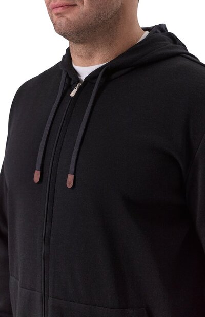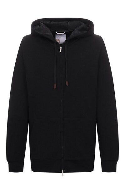 Толстовку с двумя карманами и регулируемым капюшоном выполнили из шерстяного трикотажа с небольшим добавлением полиамида. Модель застегивается встречной молнией.