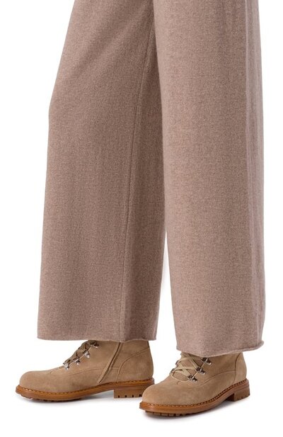 Замшевые ботинки с усиленной шнуровкой поставили на подошву с глубоким протектором. Модель, утепленная густой овчиной, застегивается молнией сбоку.