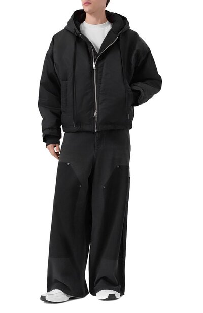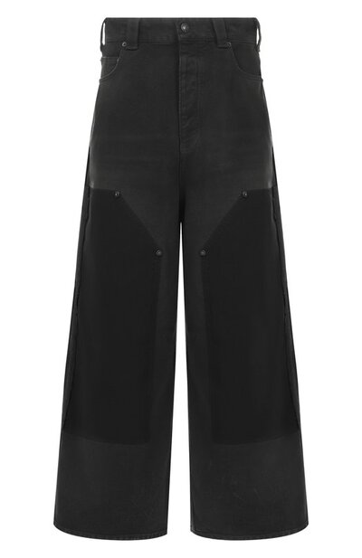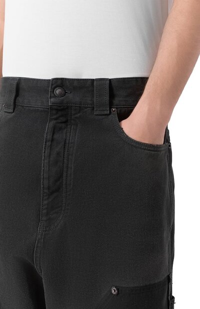 Выбеленные джинсы с потертостями и необработанными срезами швов выполнили из жесткого хлопкового денима. Модель с пятью традиционными карманами и еще несколькими карго украсили брендированными заклепками спереди и фирменным жакроном на поясе сзади.