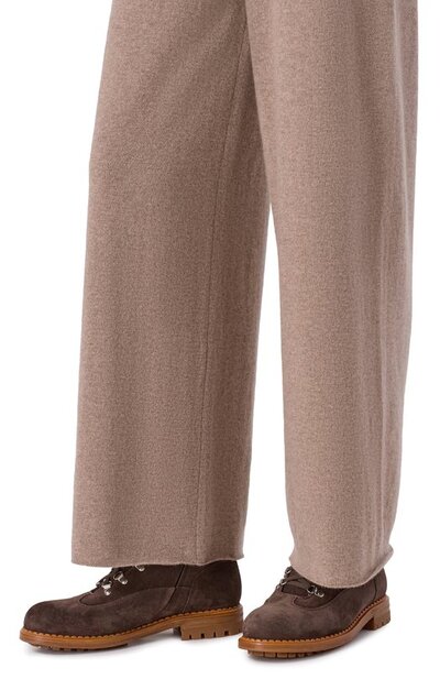 Замшевые ботинки на протекторной подошве утеплили густой овчиной. Высокую модель с усиленной шнуровкой через металлические петли дополнили молнией сбоку.