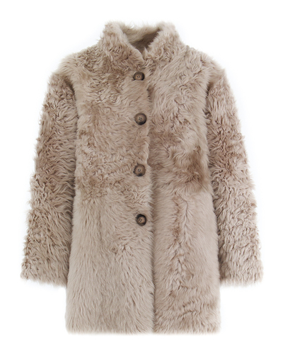 Эта дублёнка олицетворяет собой истинное искусство дизайна, сочетающее роскошь и функциональность. Её изысканный светло-бежевый оттенок придаёт модели утончённый и универсальный вид, который органично впишется в любой гардероб. Материал из нежнейшей овчины создаёт объемную, тактильно приятную текстуру, обеспечивая идеальное сочетание теплоты и стиля. Эффектные натуральные завитки подчёркивают объём и делают её визуально динамичной, добавляя элемент игривости в элегантное исполнение. Воротник-стойка обеспечивает не только тепло, но и изысканную форму изделия, подчёркивая линии шеи и дополняя общий образ современностью. Прорезные боковые карманы увеличивают функциональность модели, оставаясь одновременно практически незаметными и не отвлекая внимание от общего силуэта. Крупные пуговицы стройно выстраивают центральную линию изделия, добавляя акцент на вертикали и создавая элегантный контраст с мягким мехом. Этот изысканный акцент на застёжке позволяет создавать как более формальные, так и расслабленные образы, адаптируя дублёнку под различные стили и случаи.