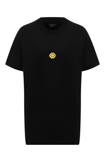 Футболка свободного кроя изготовлена из гладкого хлопкового джерси. Однотонная модель с круглой горловиной украшена спереди вышитым ярким смайлом, а сзади — принтом с логотипом марки.