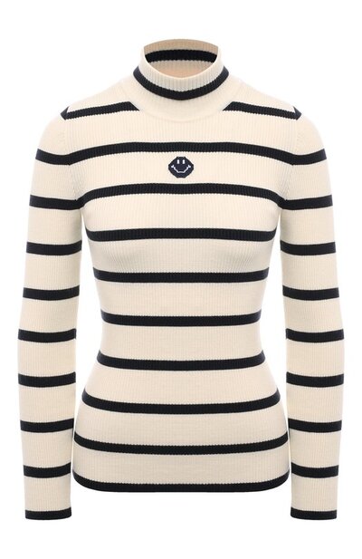 Облегающая водолазка в горизонтальную полоску поддержит повседневные образы любой сложности. Для создания модели с высокой горловиной использовали фактурный трикотаж на основе вискозы. На груди изделие украшено вышитым эмодзи.