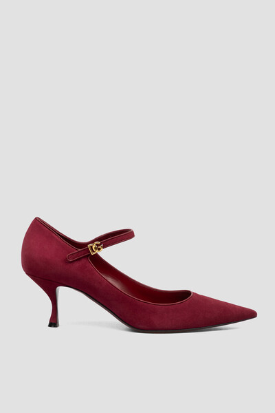 Бордовые туфли New Cardinale 60 от Dolce&Gabbana. Для производства удобной пары выбрана бархатистая замша с деталями из тонкой кожи наппа на узких канте и регулирующем ремешке с пряжкой спереди в тон. Кобурная пряжка выполнена в виде лого-монограммы DG из металла золотого оттенка. Особенностью изделия стало наличие фигурного каблука средней высоты.