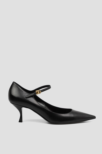 Кожаные лодочки New Cardinale 60 от Dolce&Gabbana. Модель чёрного цвета с мелкозернистой текстурой характеризуется наличием заострённого носка, визуально удлиняющего стопу, и скульптурного каблука-рюмочки средней высоты. Подъём подчёркнут регулируемым ремешком с кобурной пряжкой в виде лого-монограммы Дома, изготовленной из золотистого металла.