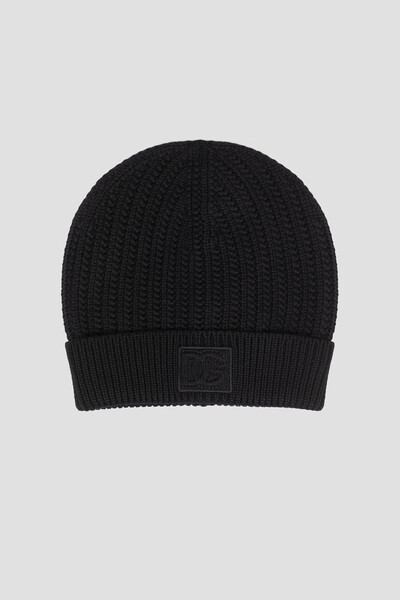 Шапка бини от Dolce&Gabbana связана английской резинкой. Для создания базового аксессуара используется пряжа на основе чистой шерсти чёрного цвета. Увеличенный отворот декорирован тональной вышивкой с рельефным лого-монограммой. Классическая округлая форма модели плотно облегает голову и подчёркивает выраженную манжету.
