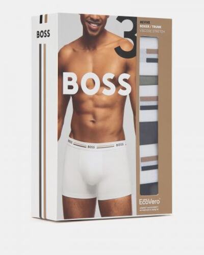 Боксеры со средней посадкой сшиты из вискозного джерси. В комплекте — трое облегающих трусов с плоскими швами и брендированными поясами-резинками.