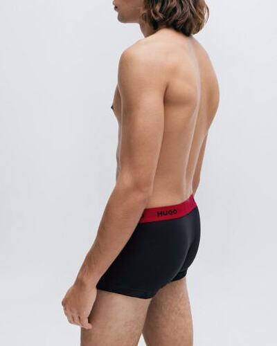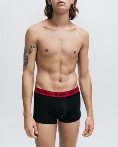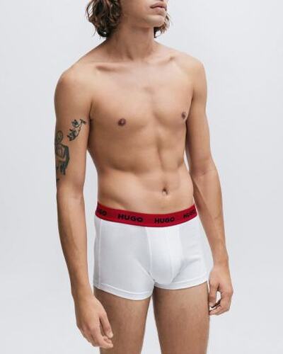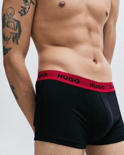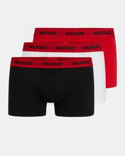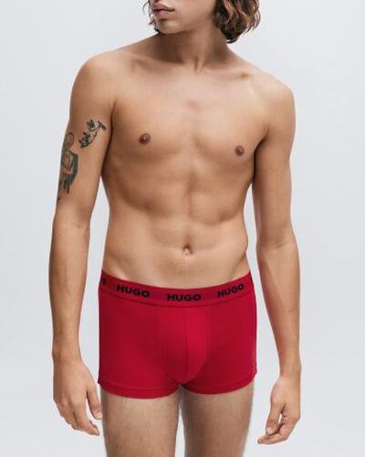 Боксеры со средней посадкой выполнили из хлопкового джерси. Широкий пояс-резинку фирменного алого оттенка украсили контрастными логотипами бренда. В комплект включили еще двое трусов разных цветов.