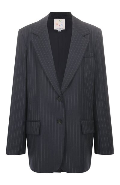 Жакет с вискозной подкладкой выполнили из шерсти в меловую полоску. Модель со шлицей сзади дополнили нагрудным и двумя боковыми карманами.