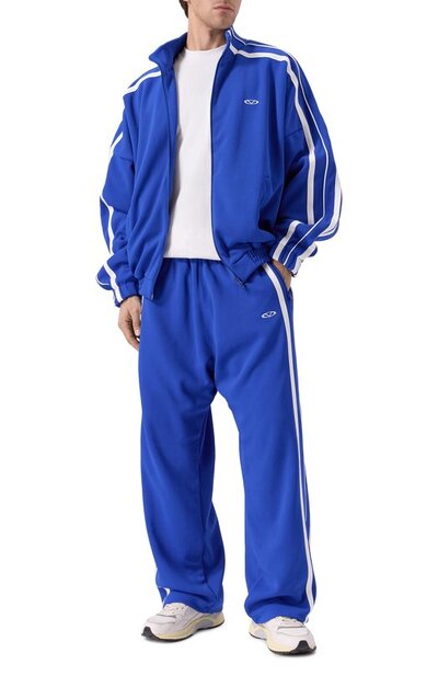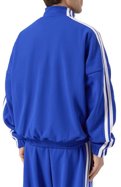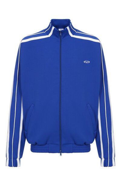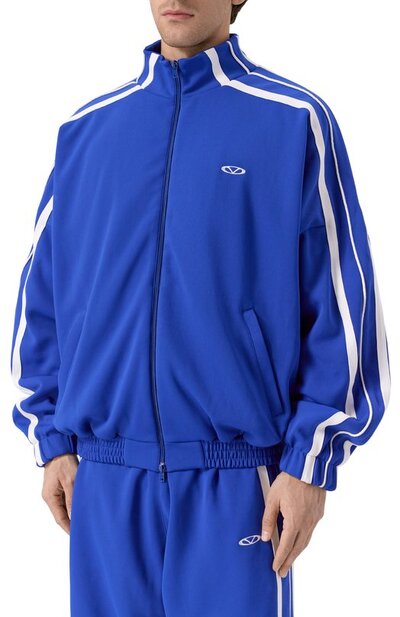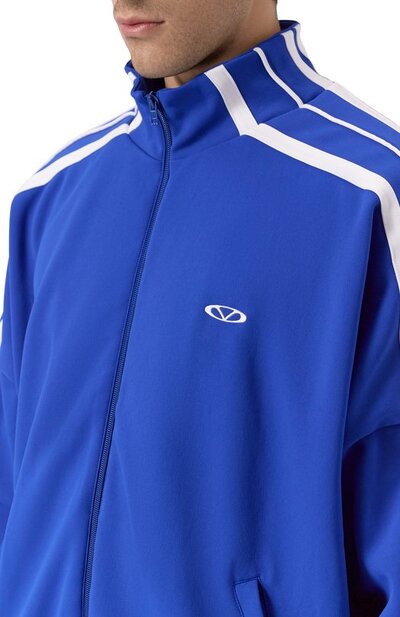 Толстовку с двумя боковыми карманами выполнили из полиэстера. Рукава модели украсили контрастными нашивками-полосами, переднюю полочку дополнили эмблемой марки, а воротник-стойку сзади декорировали логотипом бренда в тон.