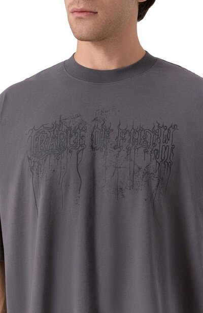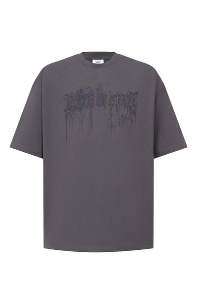Свободную футболку со спущенной линией плеч выполнили из хлопкового джерси. Спереди модель украсили готической надписью, которой вторит текстовый принт сзади, дополненный логотипом бренда.