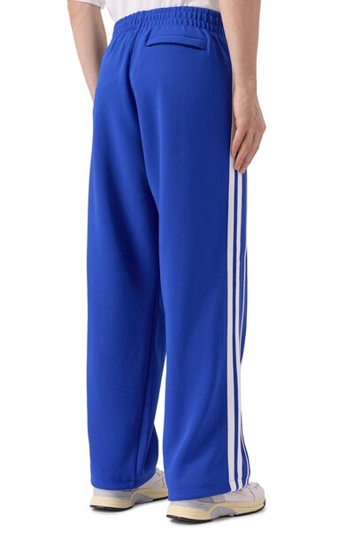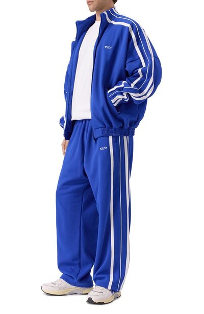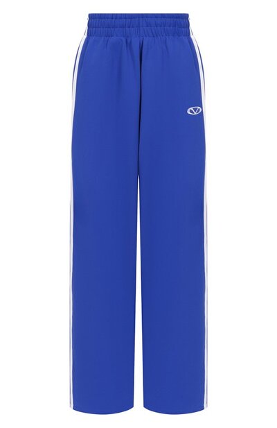 Свободные брюки с эластичным поясом и тремя карманами выполнили из полиэстера. Спереди модель украсили контрастной вышитой эмблемой бренда, которой вторят полосатые лампасы.