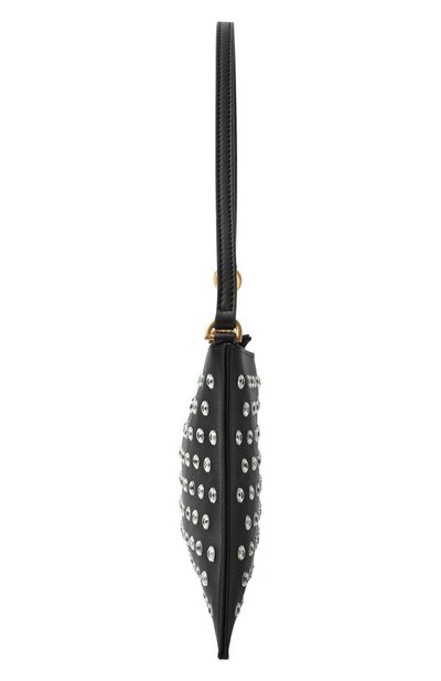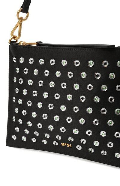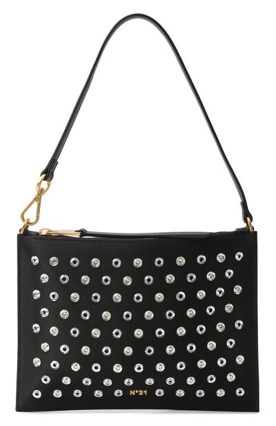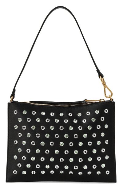 Сумку из шелковистого твила украсили прозрачными заклепками, дополнив часть из них миниатюрными кристаллами. В декор вписали металлический логотип, которому вторят молния и крепления ручки. Внутри аксессуар отделали контрастным бархатистым материалом.
