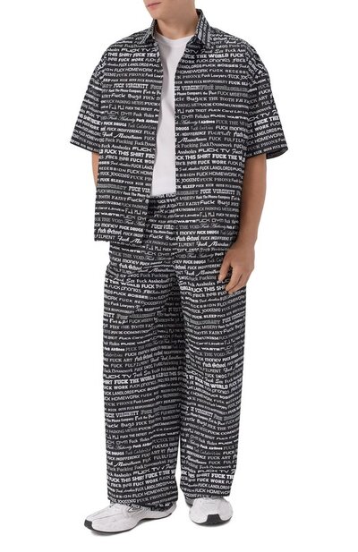 Рубашку со спущенной линией плеч и нагрудным карманом выполнили из хлопка с текстовым паттерном. Предлагаем создать непринужденный повседневный образ с парными брюками.