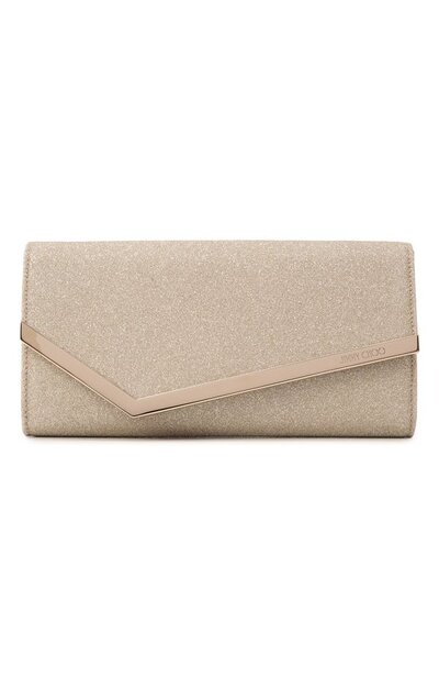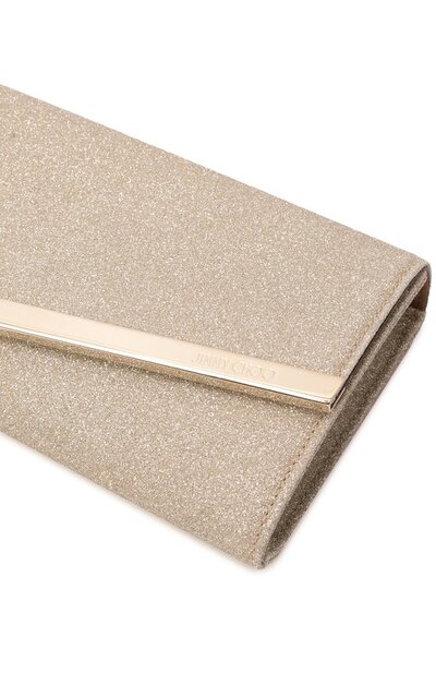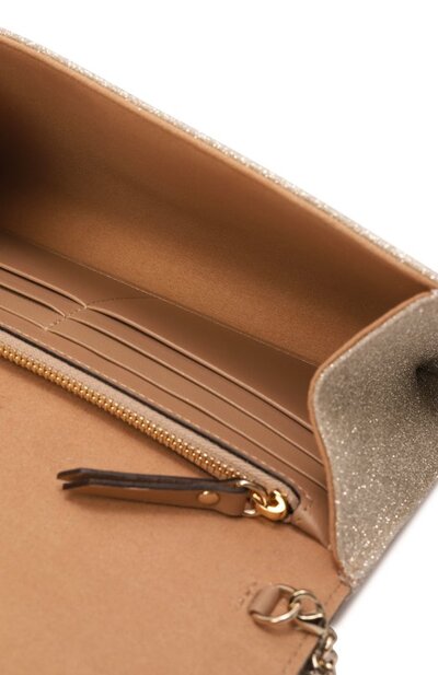 Клатч Emmie с карманом на молнии и шестью карточными слотами внутри сшили из кожи, покрытой глиттером. Фигурный клапан с магнитной кнопкой украсили золотистой пластиной с логотипом марки. Аксессуар дополнили съемным ремешком-цепочкой.