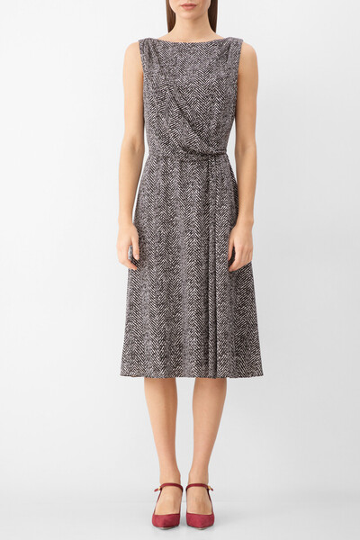 Коктейльное платье Dolce&Gabbana без рукавов. Для производства изделия приталенного и расклешенного книзу силуэта используется плотный шелковый креп с добавлением эластичных волокон. Поверхность модели с изящным округлым вырезом «лодочка» декорирована чёрно-белым шевронным принтом, добавляющим современный штрих классическому дизайну. Особенностями платья являются лиф со складками на правом боку и плиссированный подол. Изделие является образцом вневременной элегантности, идеально подходящим для особых случаев, где детали имеют значение.