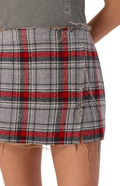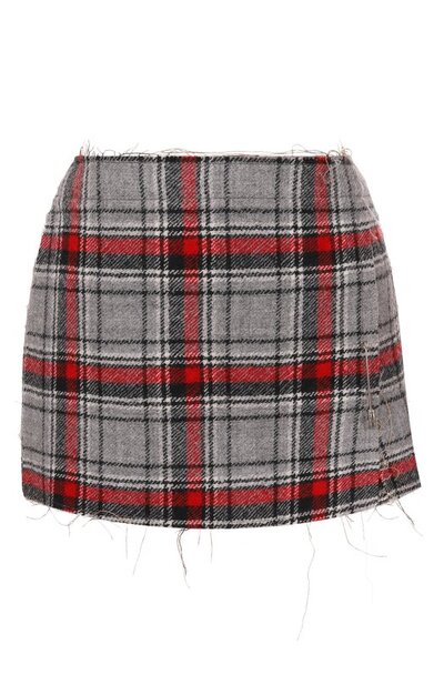 Мини-юбку с необработанными краями и имитацией запаха украсили английской булавкой спереди. Клетчатая модель из хлопковой ткани с добавлением шерсти первого пострига застегивается молнией сзади.